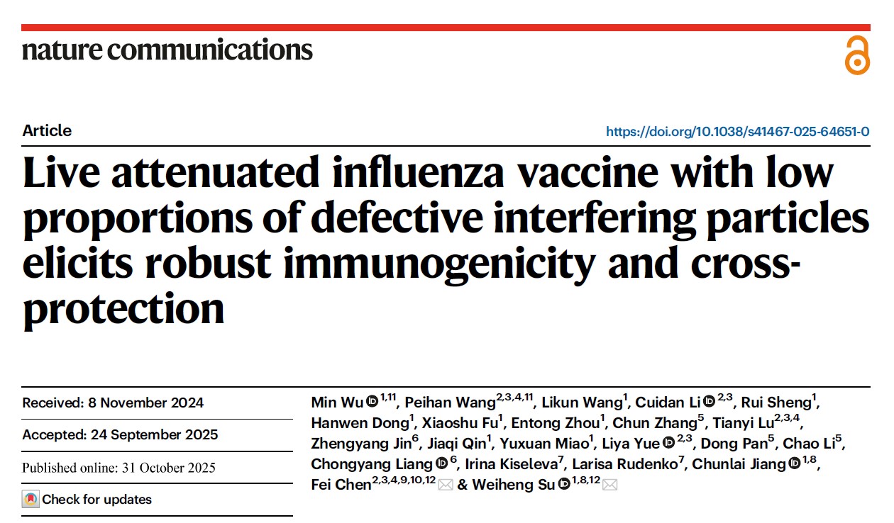 艾滋病疫苗国家工程实验室苏维恒教授团队与中国科学院北京基因组研究所陈非研究员团队合作,创新性地开发了降低DIPs含量的LAIV。该疫苗不仅具有上呼吸道复制优势,还能够增加抗原提呈,能够诱导相比传统LAIV和灭活流感疫苗显著增强的免疫原性、广谱中和活性与体内交叉保护能力,同时安全性良好。该研究为增加流感疫苗保护效力的实践提供了新策略。研究成果于2025年10月31日在国际学术期刊Nature Communications上正式发表。