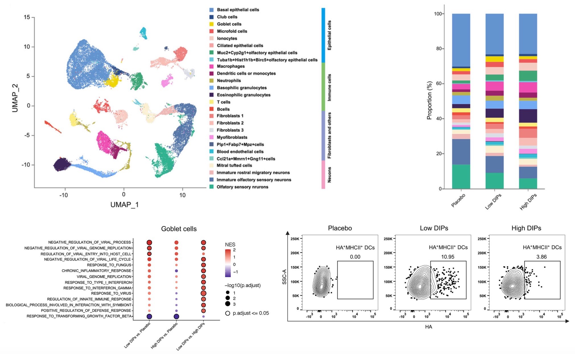 scRNA-seq显示,低DIPs LAIV的接种增加了小鼠上呼吸道中的杯状细胞、M细胞和中性粒细胞的比例。其中,还激发了杯状细胞更强的固有免疫反应与抗原摄取。这些独特的变化共同增加了DC细胞向淋巴结的疫苗抗原提呈。