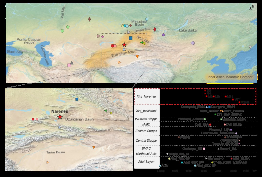 图1. 那仁苏遗址地理位置及其周边区域相关人群分布概览。 红色五角星代表本研究涉及的新疆西北部那仁苏遗址。
