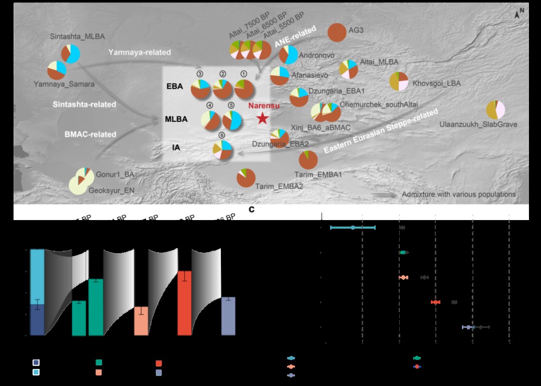 研究发现,那仁苏最早的居民(距今约4925年)是由约36%古北欧亚(ANE)相关人群与约64%阿尔泰狩猎采集者混合形成,这种遗传结构与南疆塔里木盆地的小河文化人群高度相似。这一发现证实了在草原人群大规模南下前,南北疆已存在共享ANE成分的土著人群,打破了以往关于该地区早期人群构成的认知。进入青铜时代及之后,那仁苏遗址见证了剧烈的人群融合与文化交汇。研究首次在新疆西北部发现了来自中亚南部绿洲(BMAC)与欧亚草原(Afanasievo)的遗传成分几乎同时汇聚,暗示该地可能是切木尔切克文化形成的关键区域。随后的青铜时代晚期至铁器时代,随着安德罗诺沃人群东进及东方游牧人群兴起,那仁苏人群不断融入东西方多种血统,最终形成了独特的遗传结构。
