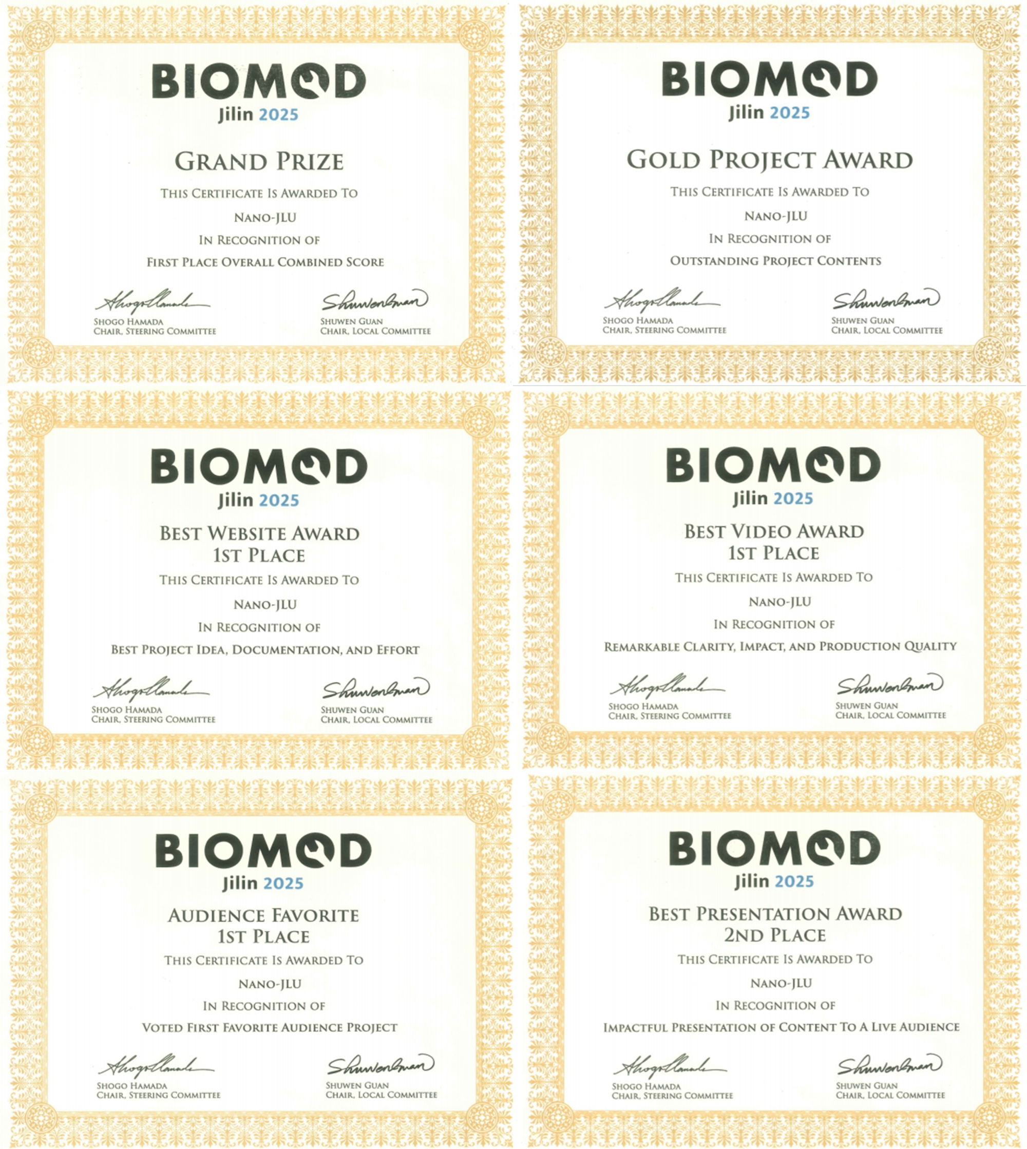 除特等奖外,团队还将五项单项奖收入囊中,分别是项目金奖(Gold Project Award)、最佳观众喜爱奖(Audience Favorite)第一名、最佳视频(Best YouTube Video)第一名、最佳网站设计(Best Project Website)第一名,以及最佳汇报(Best Presentation)第二名,展现了团队在科研创新、成果呈现、公众传播等多方面的综合实力。